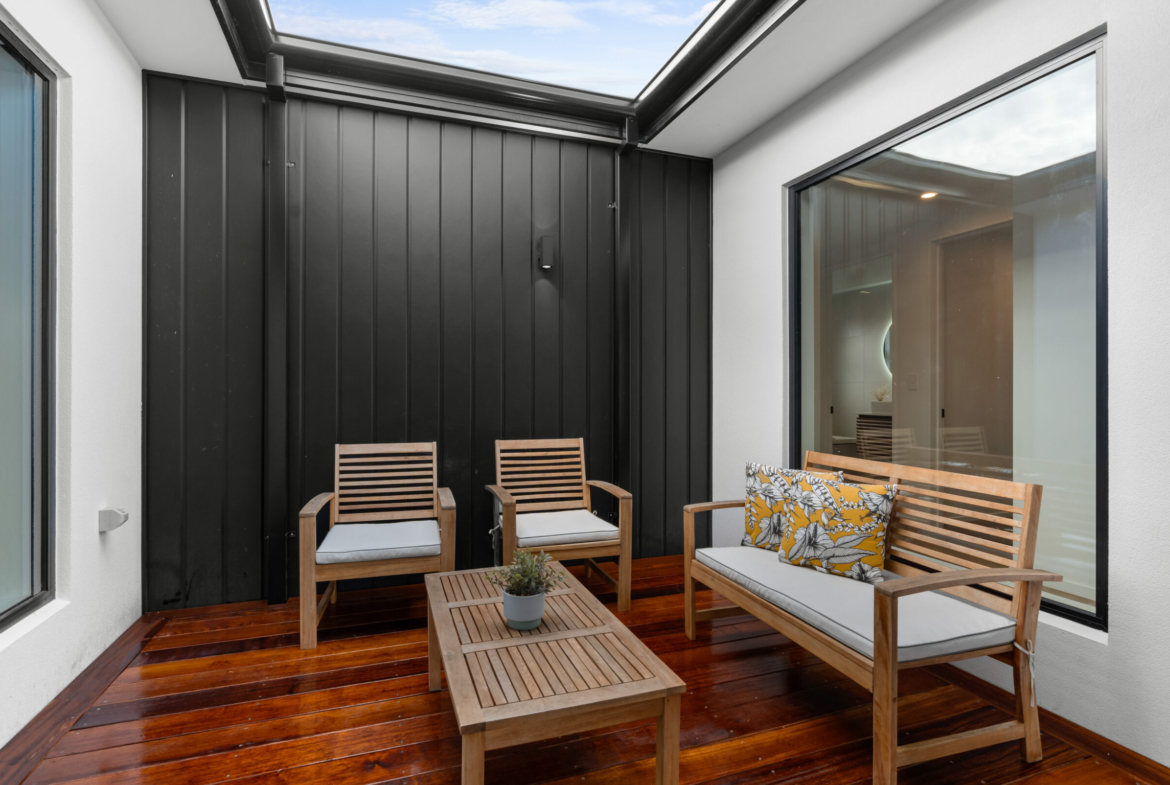 Step into a realm of architectural brilliance, where every detail has been carefully curated to perfection. The distinctive butterfly pitch roof crowns the residence, accentuating its elegance. Indulge in the finest upgrades in plumbing and kitchen specifications, and immerse yourself in the unique charm of the 10m² internal courtyard. This oasis of tranquillity, bathed in natural light and fresh air, invites you to relax and rejuvenate, making every moment at home a serene experience.